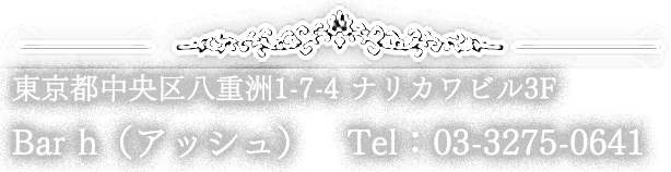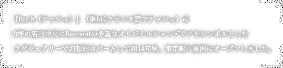 『Bar h(アッシュ)』(hはフランス語でアッシュ)は、9坪の店内中央にBaccaratの多重なオリジナルシャンデリアをシンボルとしたラグジュアリーで幻想的なバー空間として、 2014年秋、東京八重洲にオープンしました。