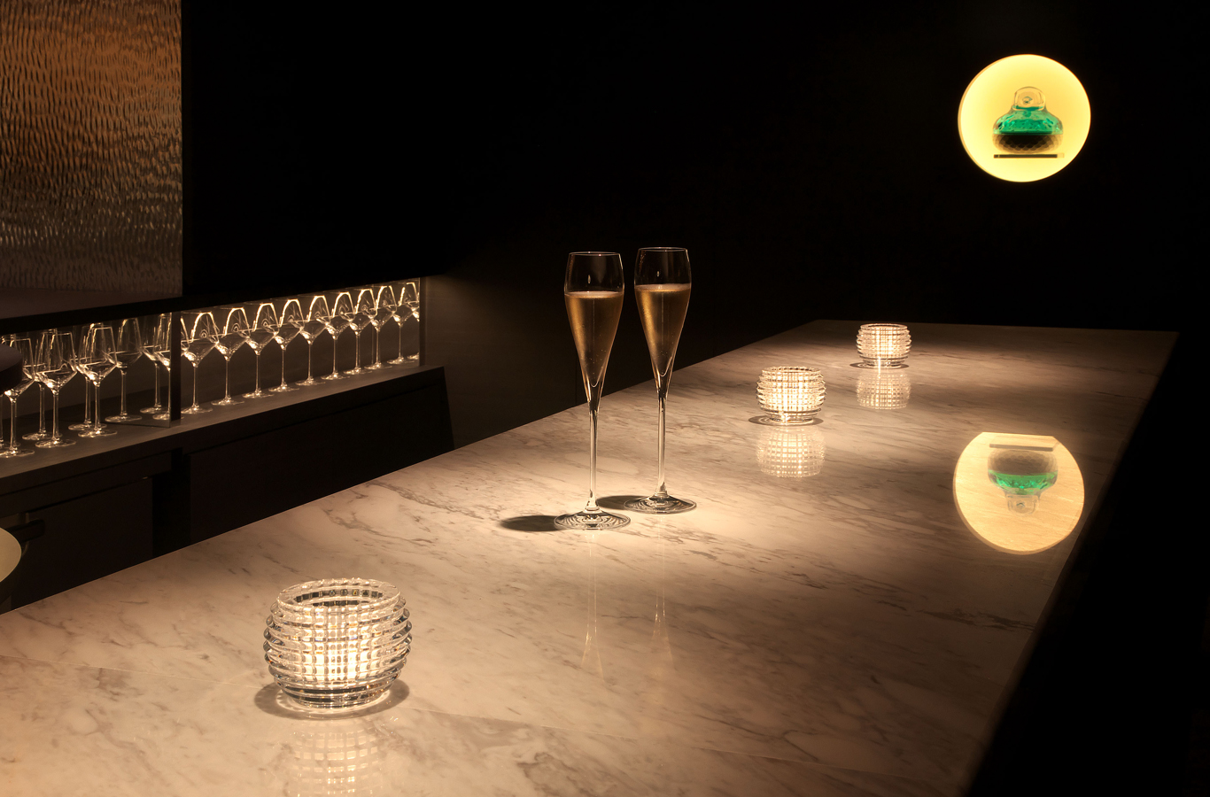 またBaccarat以外にもクリスタルグラスにこだわった華やかなワイングラスや遊び心溢れるガラスのオブジェクトなどでお客様をお迎え致します。
